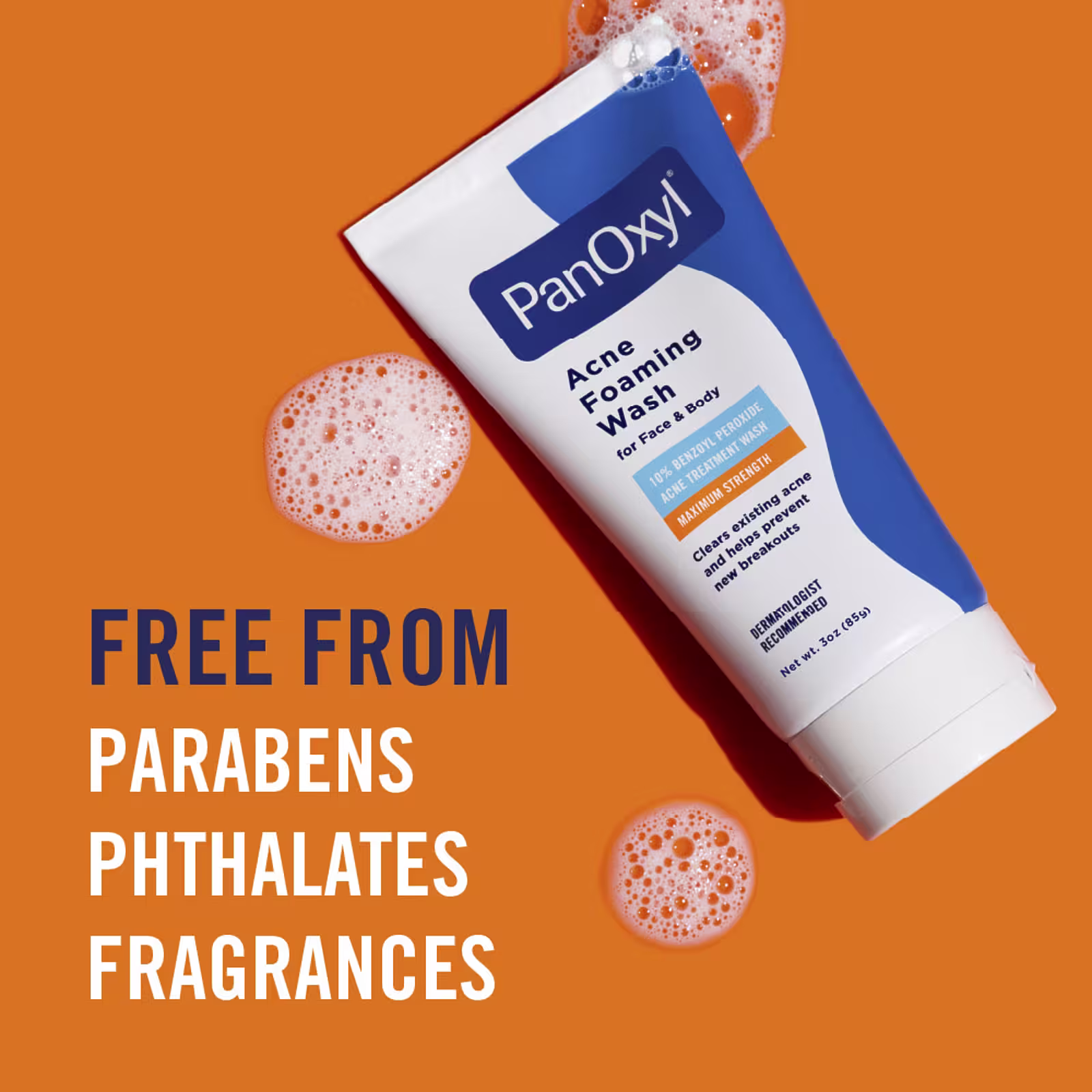 Gel nettoyant Maroc anti-acné 10% : la mousse nettoyante visage PanOxyl purifie en profondeur, réduit l’excès de sébum et aide à prévenir boutons & points noirs. Visage, dos, torse – usage quotidien.